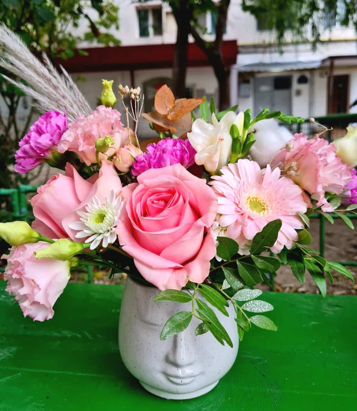 Acest produs contine: trandafiri, frezii, crin peruvian, gerbera, lisianthus, crizantema, garoafe, eucalipt, vas ceramic si alte materiale.