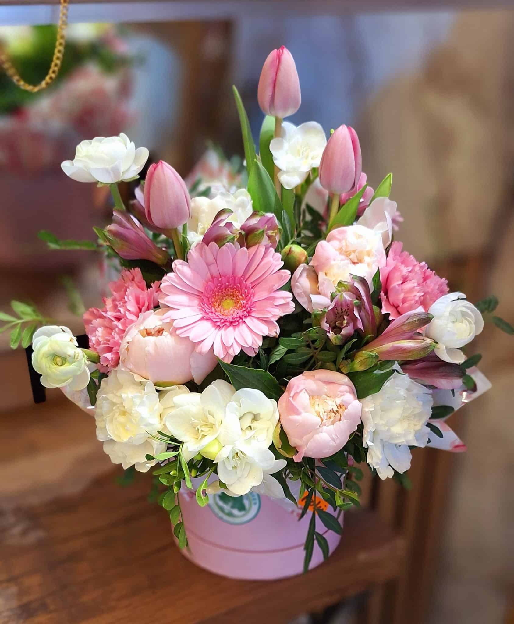 Aranjament floral în cutie, compus din bujori, frezii, lalele, gerbera, alstroemeria și alte plante și materiale.