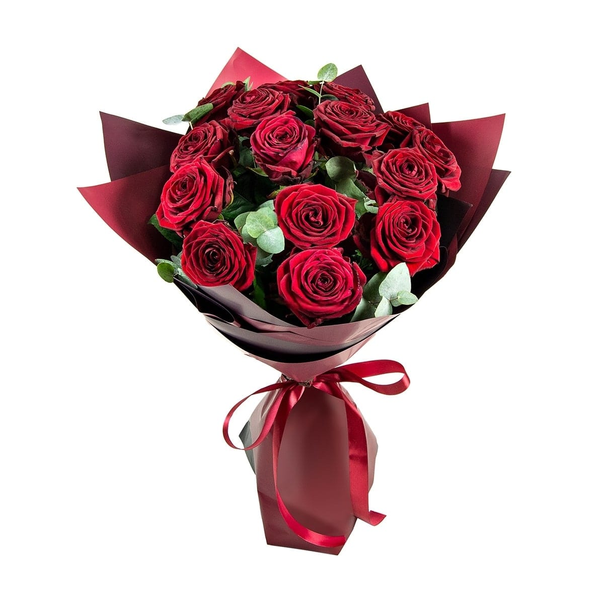 Acest buchet contine: 15 trandafiri rosii, 1 pachet eucalipt, 3 coli, funda si alte materiale.