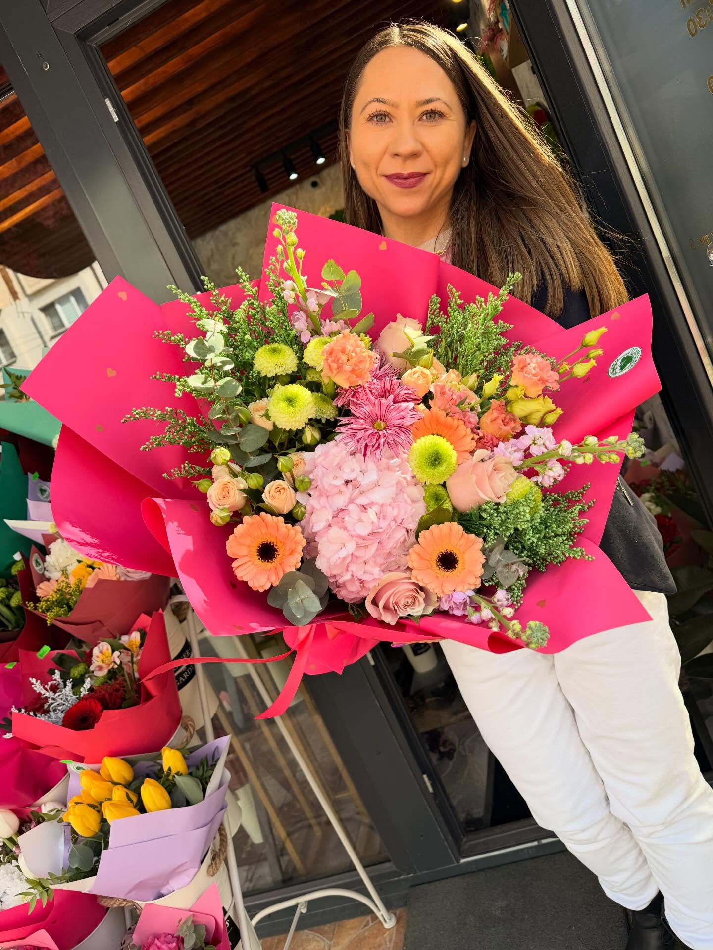 Buchet de primăvară elegant și vibrant, în nuanțe pastelate, realizat din hortensie roz, gerbera, trandafiri și alte flori de primăvară. Perfect pentru a transmite emoție și bucurie cu orice ocazie specială. Disponibil la Florăria Green Focșani, cu livrare rapidă direct la ușa destinatarului.