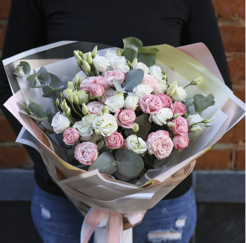 Alege un cadou delicat și plin de rafinament cu acest buchet elegant, care combină 6 mini trandafiri plini de farmec cu 5 eustoma grațioase și frunze de eucalipt, pentru un parfum subtil și un aspect deosebit. 🌸🌿