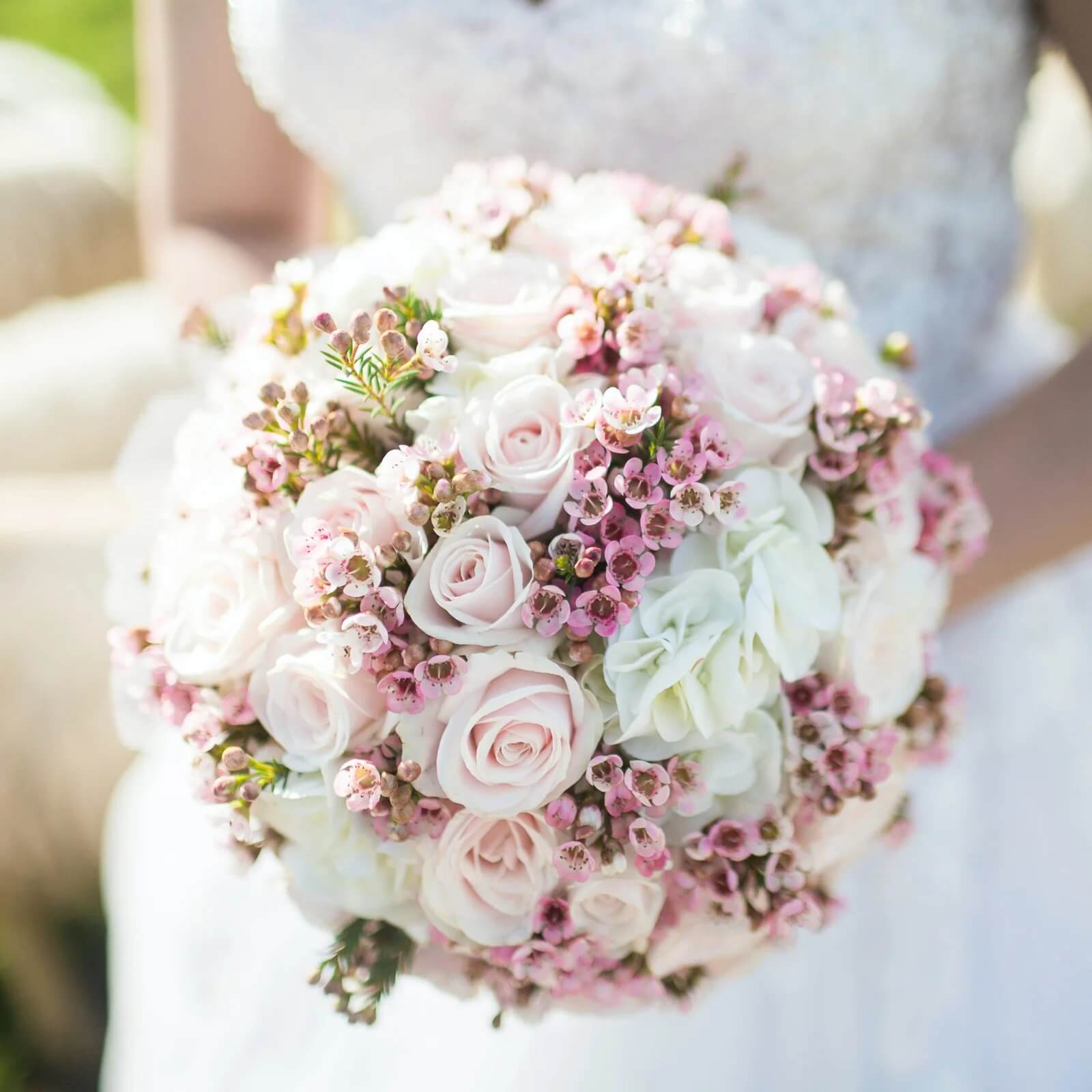 🌹 Flori utilizate: trandafiri albi, trandafiri roz, hortensie, wax flowers