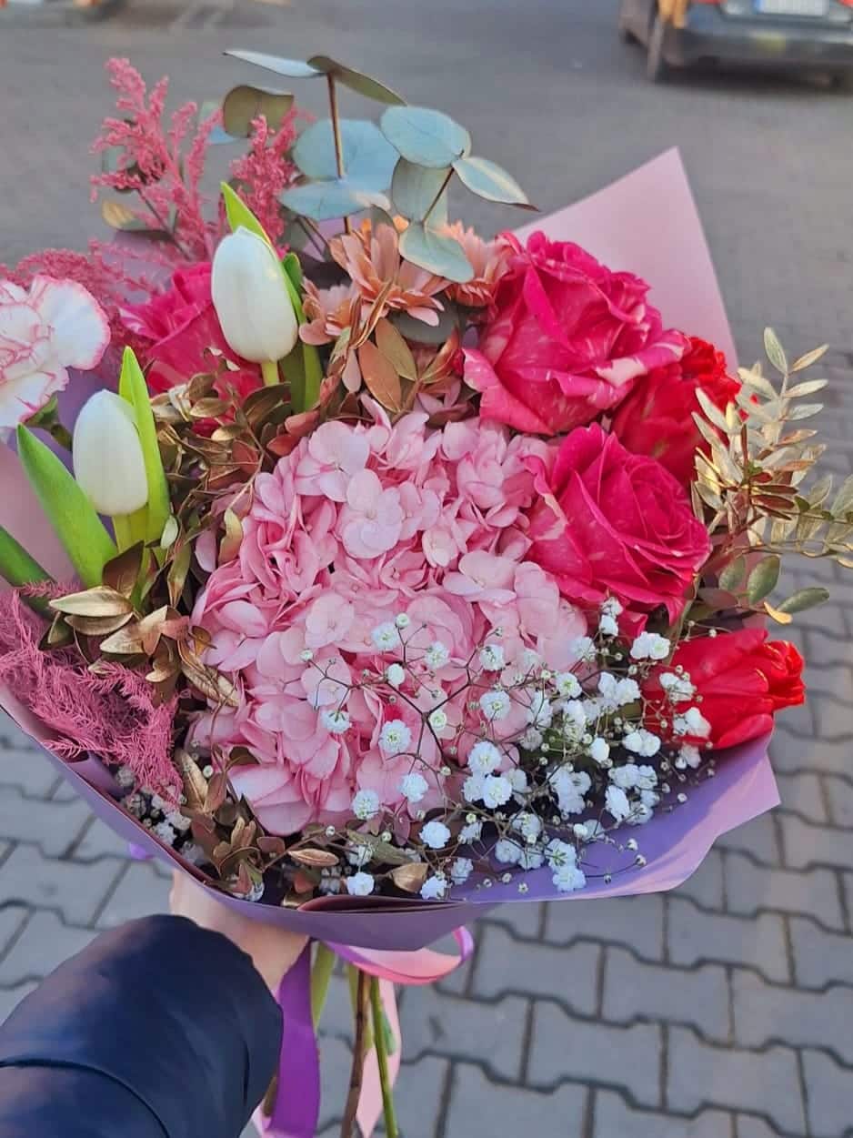 Acest buchet contine: trandafiri, lalele, hortensie, eucalipt, crizantemă, 3 coli, funda si alte materiale.