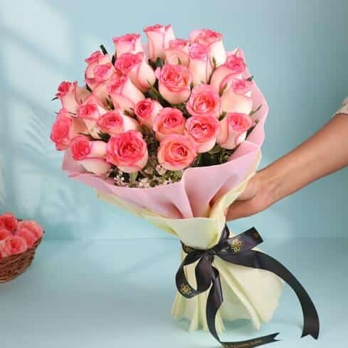 Acest buchet spectaculos cu 25 de trandafiri roz transmite feminitate, rafinament și dragoste sinceră. Ambalat elegant în hârtie roz și ivoire, este alegerea perfectă pentru a surprinde persoana iubită sau pentru a marca momente importante din viață.