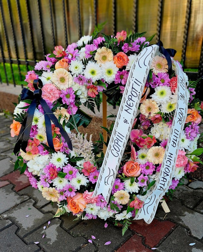 Această coroană funerară cu diametrul de ~65 cm este creată cu sensibilitate din flori deosebite, îmbinați armonios.