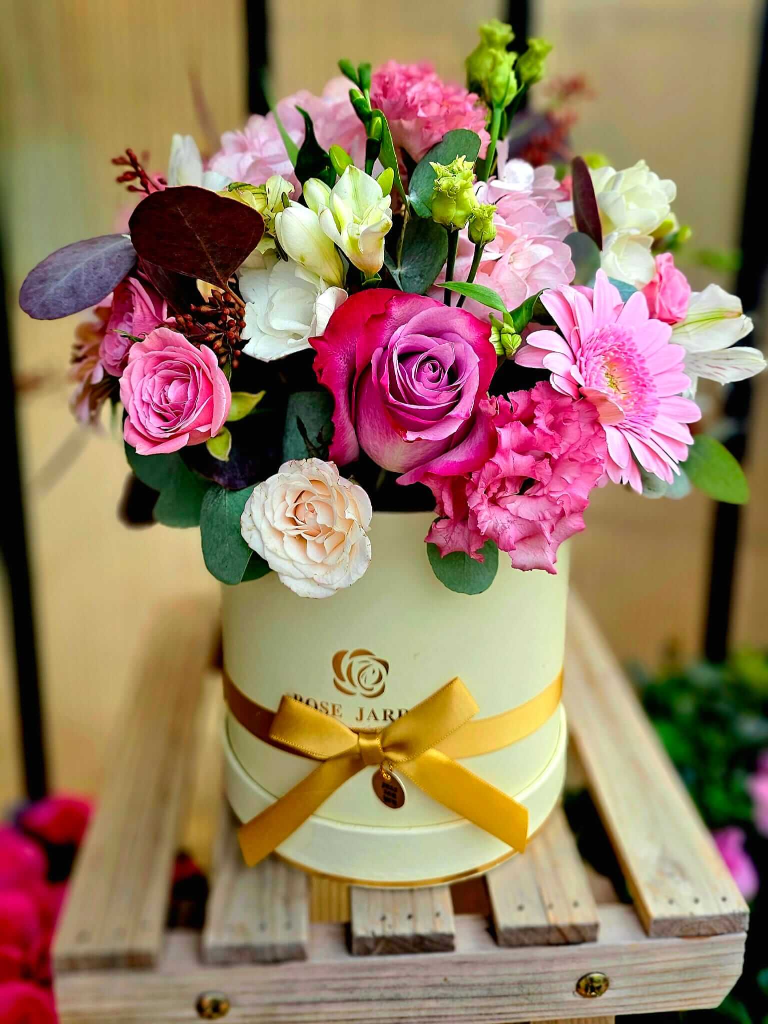 Acest aranjament în cutie realizat cu mare atenție din trandafiri, gerbera, eustoma, frezii, eucalipt și alte flori și plante deosebite este alegerea perfectă atunci când cauți un cadou pentru cei dragi. Trandafirii transmit tandrețe și admirație, iar eucaliptul adaugă prospețime și un parfum discret.